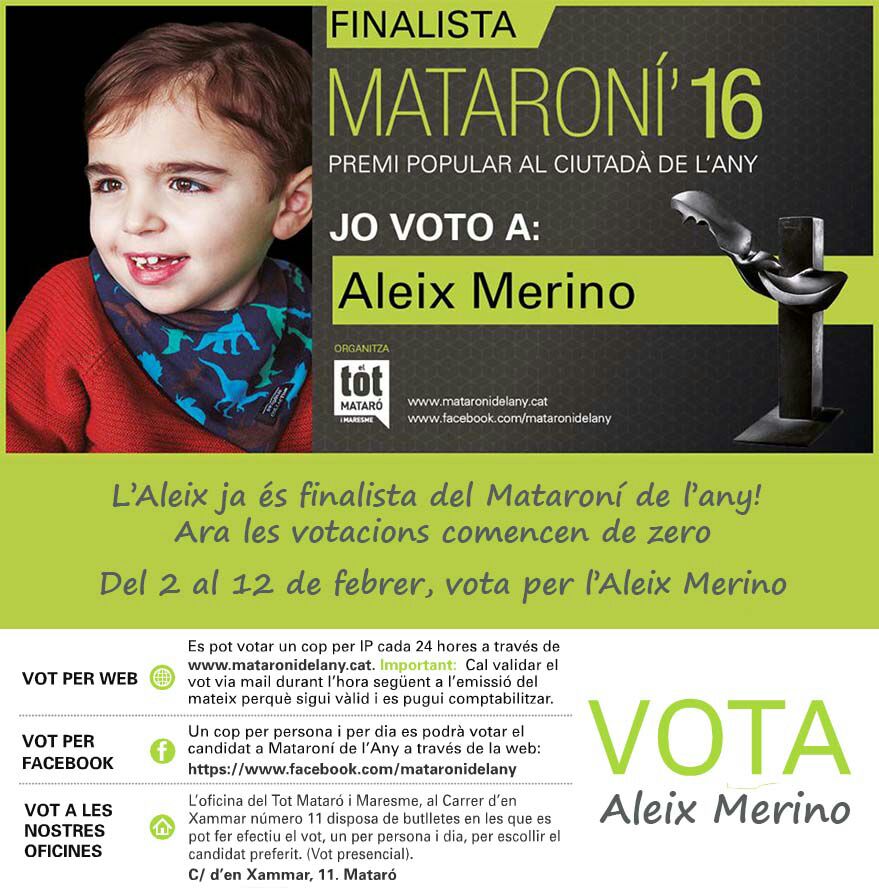 Y bueno para acabar queria recordaros dos cosillas la primera es que esta en marcha la 2°fiesta solodaria un somriure per l’Aleix que esta prevista para el 2 de Abril asi que si quereis ayudar a lo quesea podeis poner en contacto con ellos desde faccebok «un sonriure per l’Aleix» y la segunda esque he llegado a la final de mataroni de l’any que yo la verdad no se que significa pero mis papas me dicen que es un premio que obto por ser un guerrero….yo un guerrerooooo si no tengo ni espada ni escudo solo un corazon y una sonrisa que lucha contra todo,asi que os dejare el enlace para que voteis «pero a mi» jajaja no se pero si a mis papas les hace ilusion a mi tambien asi que a por ello.
